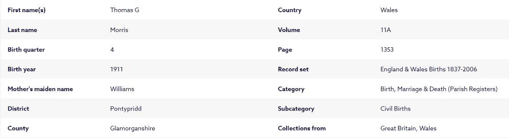 Thomas Glanville MORRIS, son of Joseph MORRIS (1885-1957) and Sarah Ann WILLIAMS (1887-1964), was born on October 8, 1911 in Pontypridd. He died in 1999 in Pontypridd. He and Winifred Edna EVANS had the following children: |
