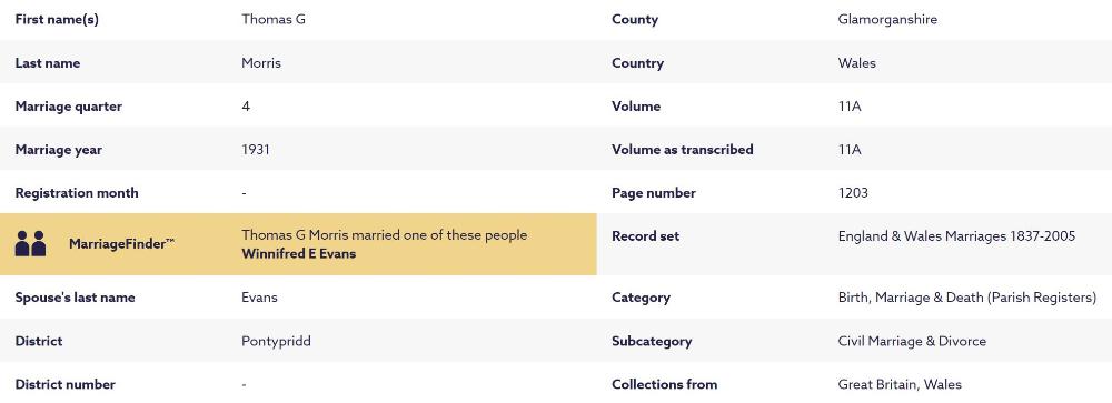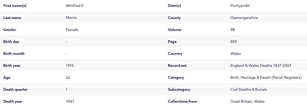 Winifred Edna EVANS, daughter of David John EVANS and Margaret PROSSER, was born on November 27, 1914 in Ynyshir. She married Thomas Glanville MORRIS in 1931 in Pontypridd. She died in 1947 in Pontypridd. |
