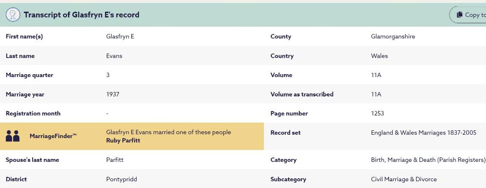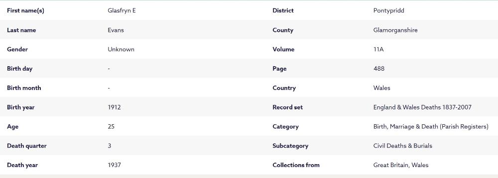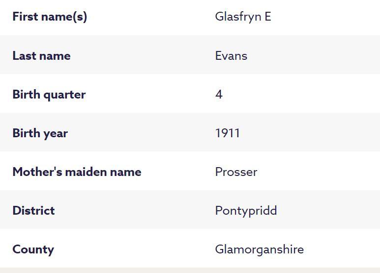 Glasfryn Evan EVANS, son of David John EVANS and Margaret PROSSER, was born in 1911 in Ynyshir. He married Ruby PARFITT in 1937 in Pontypridd. He died on August 13, 1937 in Ynyshir. |