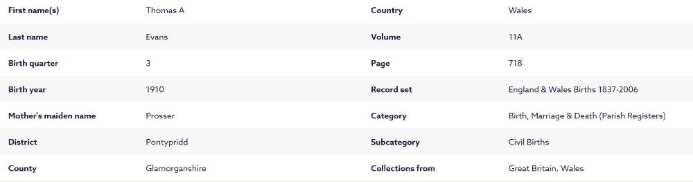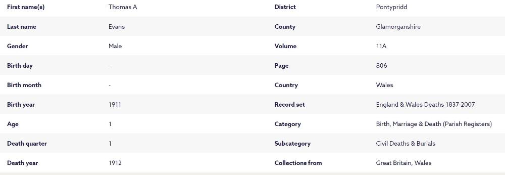 Thomas Arthur EVANS, son of David John EVANS and Margaret PROSSER, was born in 1910. He died in 1912. |