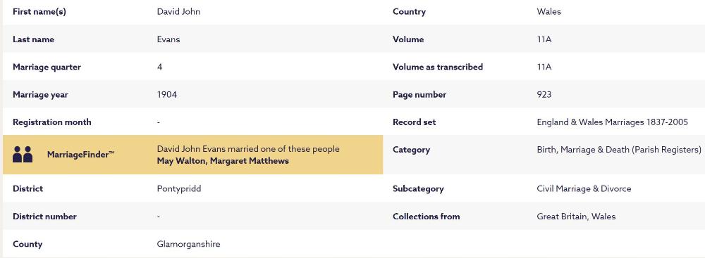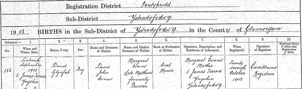 David John EVANS, son of Daniel EVANS (1833-1880) and Elizabeth DAVIES (1830- ), was born in 1868 in Merthyr Tydfil, Glamorgan, Wales. He married Margaret PROSSER in 1904. He died in 1933 in Pontypridd, Glamorganshire, Wales. |
