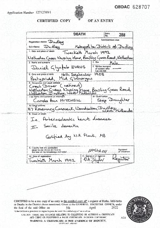 Daniel Glynfab EVANS, son of David John EVANS and Margaret PROSSER, was born on September 16, 1908 in Ystradyfodwg Glamorgan. He married Nora Beatrice SHAKESPEARE in 1934 in Dudley. He died of Artheriosclarotic heart disease on March 20, 1992 in Netherton Green Nursing Home Dudley. He had a relationship with Margaret CHESTNUTT. |