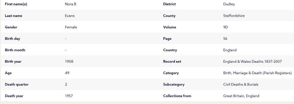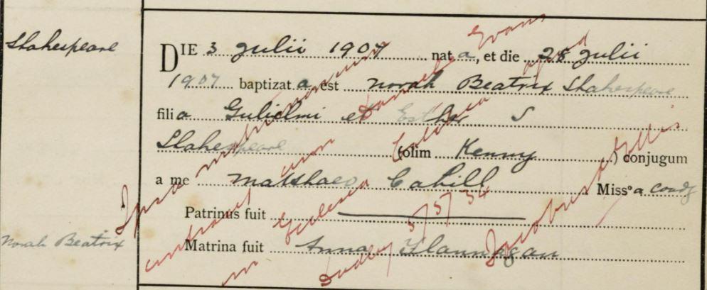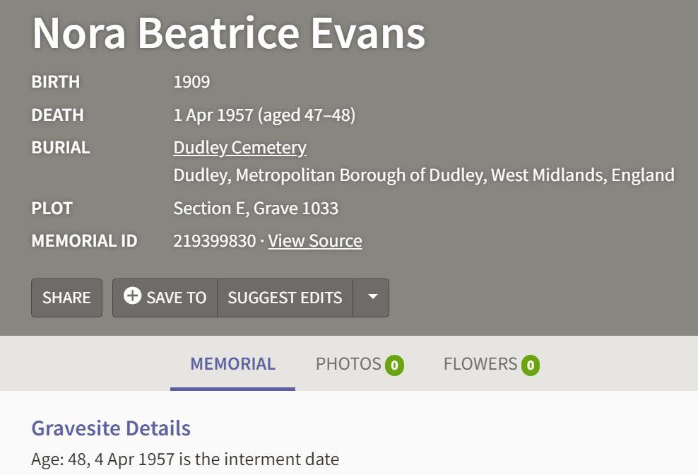 Nora Beatrice SHAKESPEARE, daughter of William SHAKESPEARE (1882-1931) and Esther KENNY (1882-1952), was born on July 3, 1907 in Dudley. She was baptised on July 28, 1907 in Dudley, Our Blessed Lady & St Thomas of Canterbury. She died on April 1, 1957 in Dudley. She and Daniel Glynfab EVANS had the following children: |