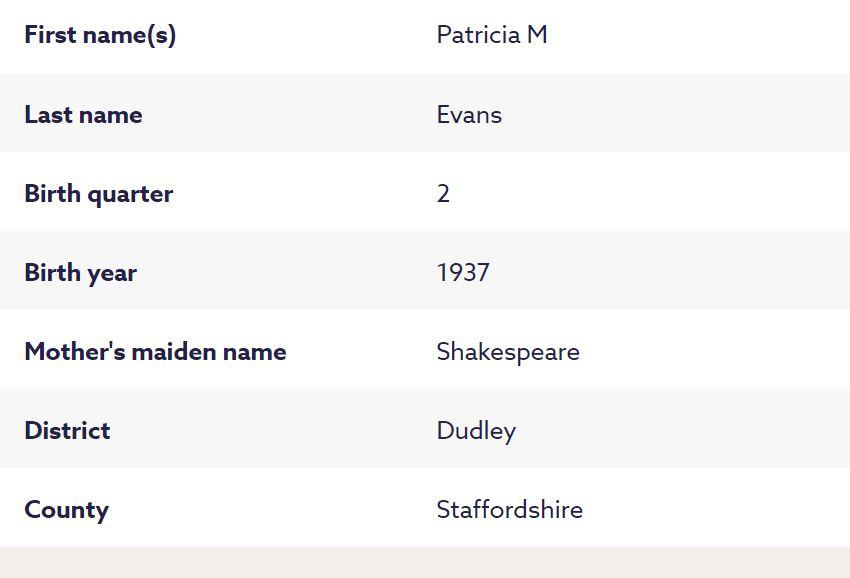 Patricia M EVANS, daughter of Daniel Glynfab EVANS and Nora Beatrice SHAKESPEARE, was born in 1937 in Dudley. |
