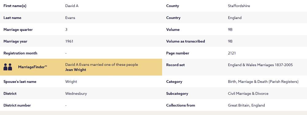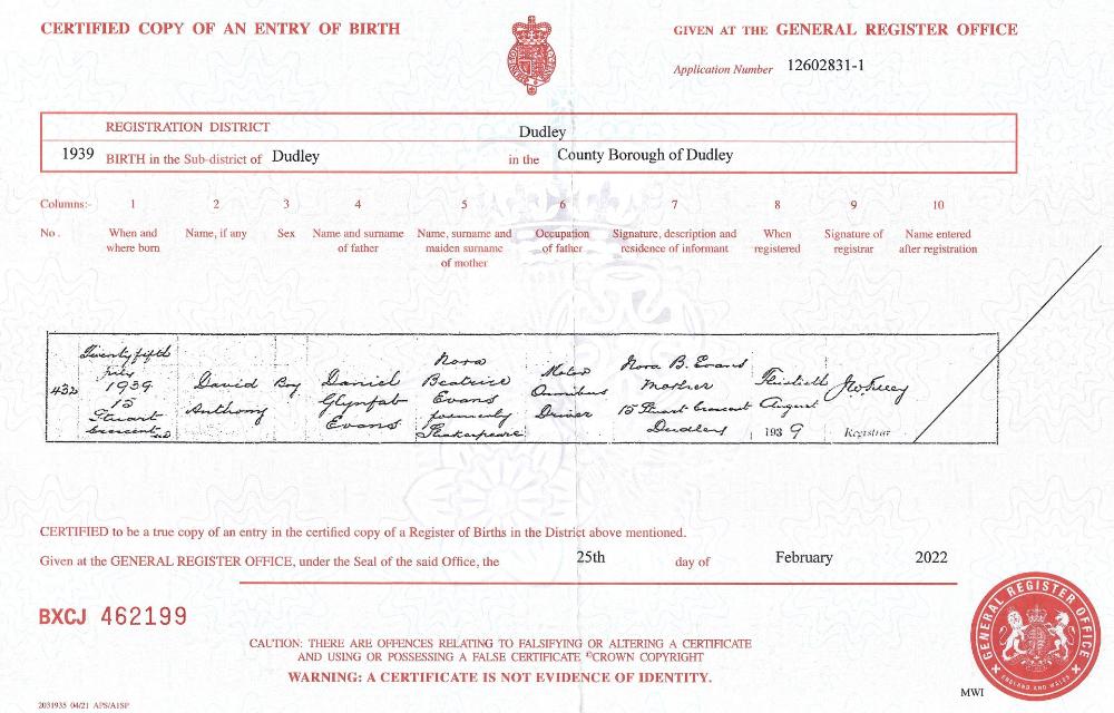David Anthony EVANS, son of Daniel Glynfab EVANS and Nora Beatrice SHAKESPEARE, was born on July 15, 1939 in Dudley. He married Jean WRIGHT in 1961 in Wednesbury Staffordshire. |