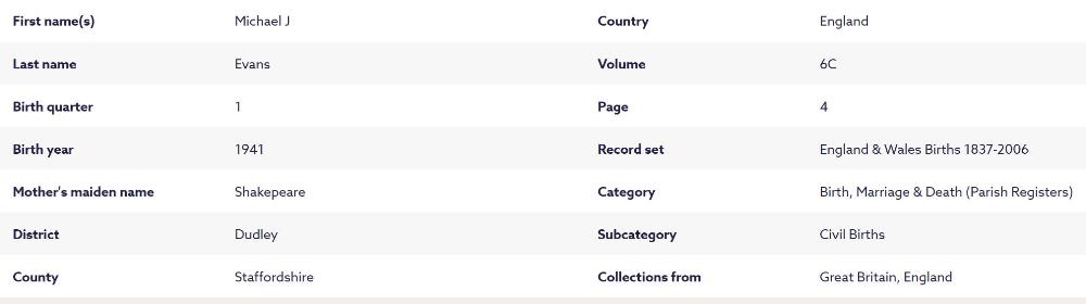 Michael J EVANS, son of Daniel Glynfab EVANS and Nora Beatrice SHAKESPEARE, was born in 1941 in Dudley. He married Glenys BUTCHER in 1963 in Dudley. |