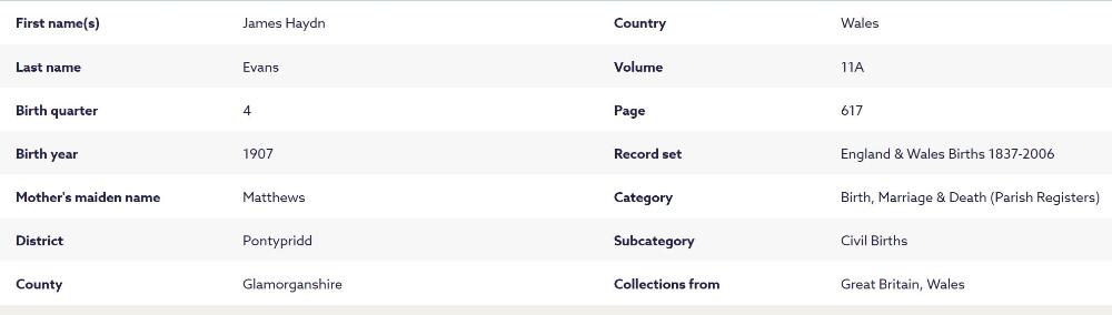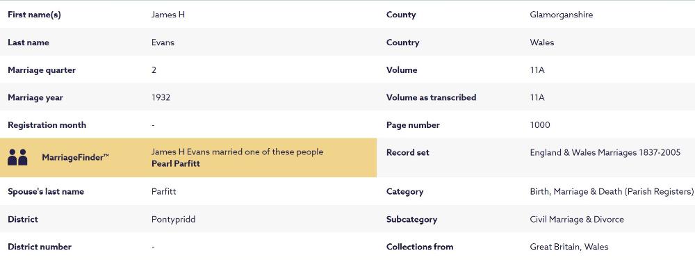 James Hadyn EVANS, son of David John EVANS and Margaret PROSSER, was born on August 27, 1907 in Ynyshir. He married Pearl PARFITT in 1932 in Pontypridd, Glamorganshire, Wales. He died on November 25, 1984 in Ynyshir. He died in November, 1984 in Pontypridd. |