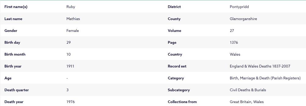 Ruby PARFITT was born on October 29, 1911 in Bedwellty Monmouthshire. She married David W MATHIAS in 1949. She died in 1976 in Pontypridd. |