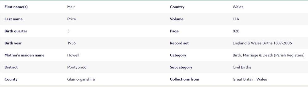 Mair PRICE was born on August 14, 1936 in Pontypridd. She died in 1996 in Pontypridd. She and Brian MORRIS had the following children: |